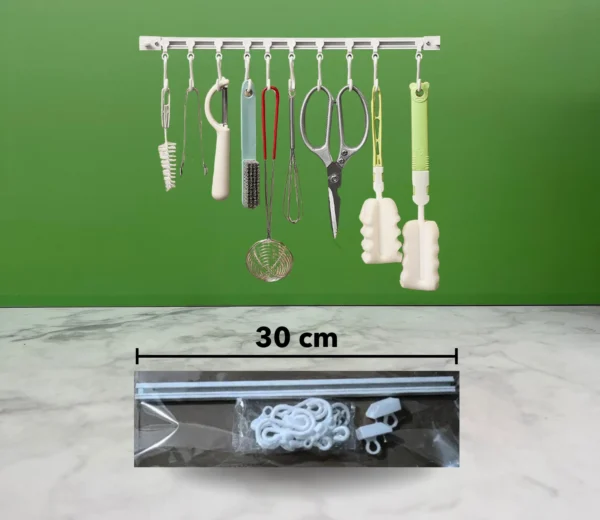 🪝 Ideales para la cocina, baño o cualquier espacio donde necesites colgar utensilios de manera práctica y ordenada, incluye una barra resistente con ganchos móviles para facilitar el almacenamiento de tijeras, cucharones, esponjas, cepillos y más.