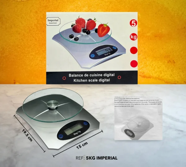 Diseño moderno y compacto con plataforma de vidrio templado, ideal para pesar ingredientes sólidos o líquidos.