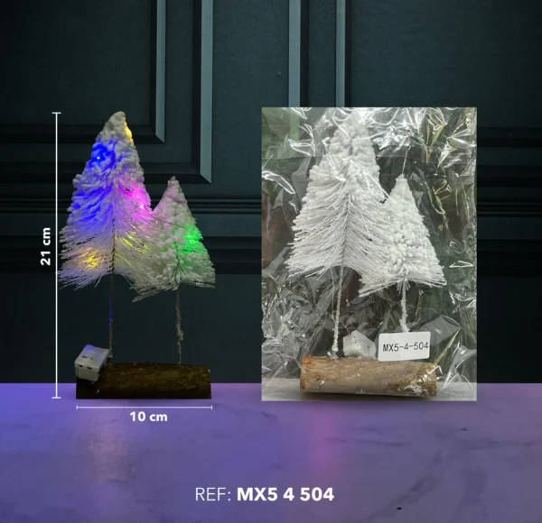 Este elegante adorno combina dos pinos nevados con una cálida iluminación LED de colores, creando un efecto acogedor y festivo.