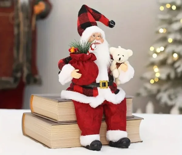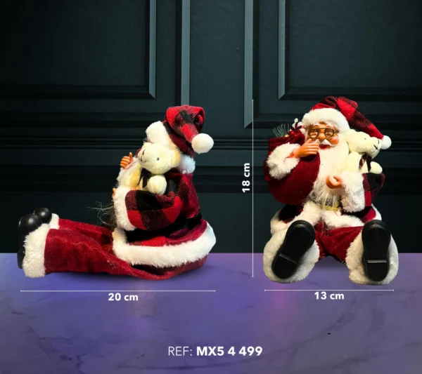 • Diseño premium: con traje de terciopelo rojo, detalles en peluche blanco y gorro de cuadros.