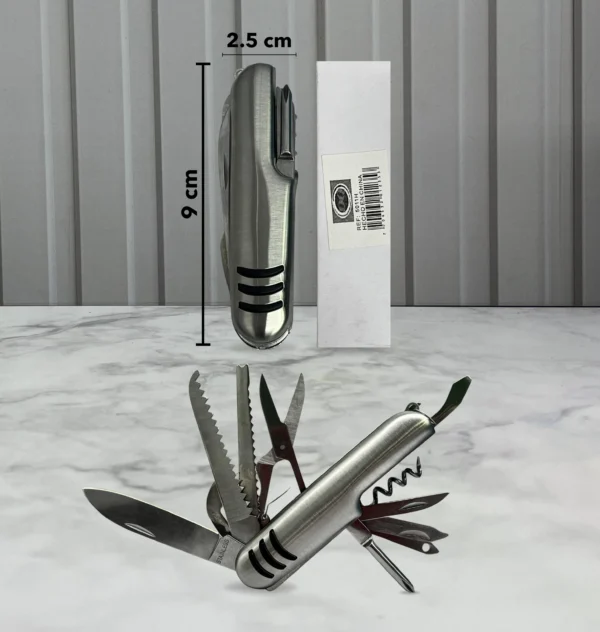 Navaja multifuncional para exteriores con destapador y herramientas esenciales, ideal para camping y aventuras. compacta, práctica y resistente.