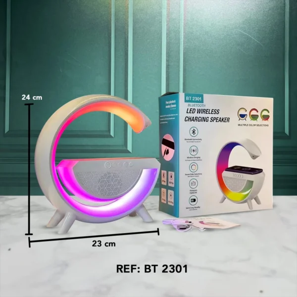 El Parlante Forma G BT‑2301 es el complemento perfecto para tu escritorio, habitación o ambiente de ocio: altavoz Bluetooth, luz LED y base de carga inalámbrica, todo con un diseño moderno “G”.