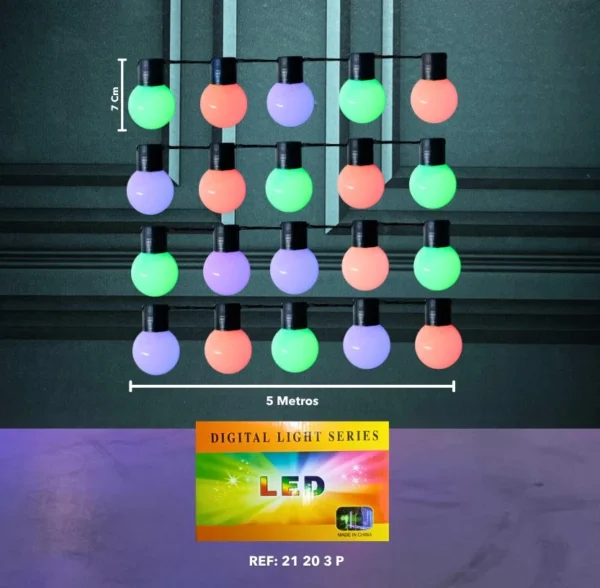 Dale vida y color a tus espacios con este alegre ramal de 20 bombillos LED multicolor. Ideal para decorar fiestas, terrazas, balcones, jardines o cualquier rincón donde quieras un ambiente lleno de energÃa y diversión.