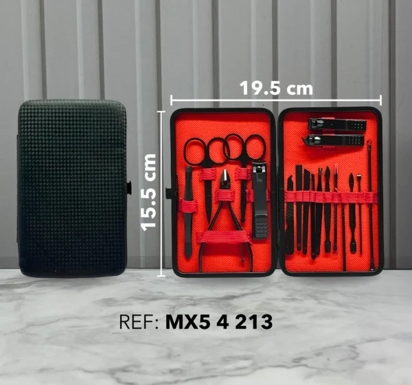 • Incluye cortaúñas, tijeras, pinzas, empujador, cortacutículas, todo en un estuche compacto.