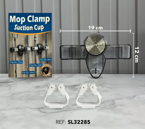 Práctico soporte de succión. Diseñado para sostener escobas, trapeadores y otros accesorios de limpieza, sin necesidad de perforar paredes.