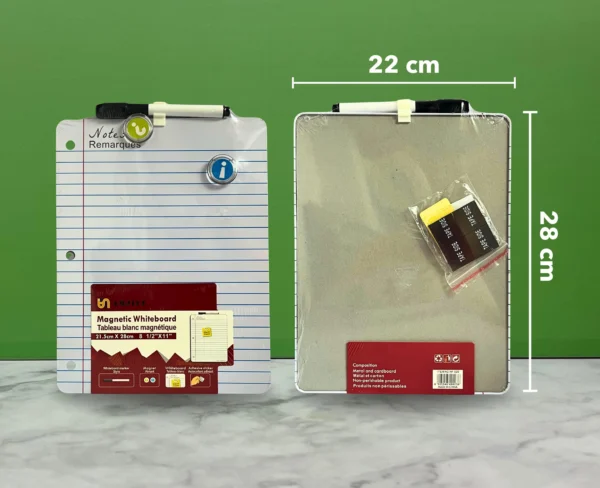 Este versátil tablero cuenta con superficie blanca para escribir con marcador borrable y sistema magnético para sujetar notas, recordatorios o documentos con imanes. Perfecto para el hogar, la oficina, clases o planificadores personales.