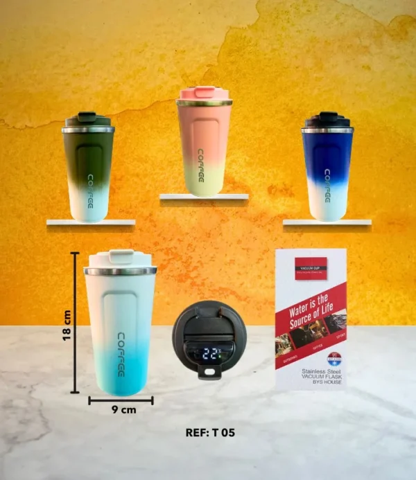 Moderno, práctico y elegante. Este termo mantiene tus bebidas frías o calientes durante horas y cuenta con un termómetro digital en la tapa que muestra la temperatura al instante con solo tocarla.