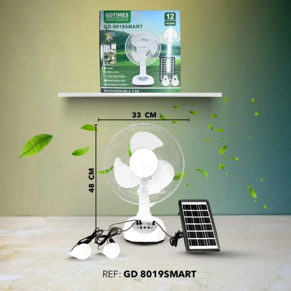 El Ventilador Recargable con Panel Solar GD 8019SMART 12” es la solución ideal para mantenerte fresco en cualquier lugar, incluso en apagones o zonas sin luz.